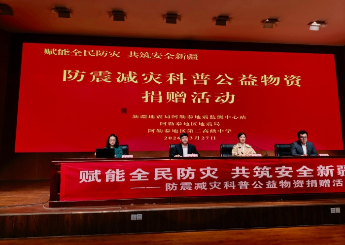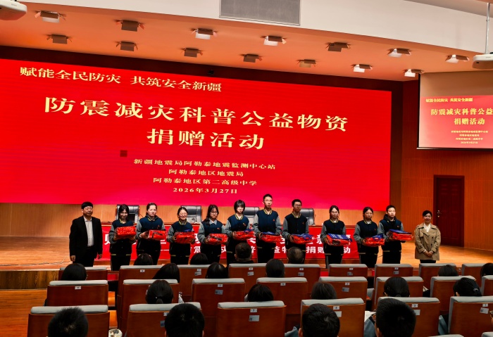 您的当前位置: 首页 > 要闻动态 > 市县工作 阿勒泰地区举办防震减灾科普公益物资捐赠活动 发布时间:2026-04-01 10:45:35 来源:阿勒泰地震监测中心站 【字号: 大 中 小 】 打印 浏览量:0 3月27日,“赋能全民防灾,共筑安全新疆”防震减灾科普公益物资捐赠活动在阿勒泰地区第二高级中学开展,阿勒泰地震监测中心站、地区地震局及学校师生300余人参与。 活动现场,中心站宣讲员开展防震减灾科普宣讲,向师生普及地震预警、应急避险等实用知识与技能。捐赠仪式上,捐受双方完成捐赠牌交接并合影留念,捐赠方还发放了地震应急包和宣传手册,受赠方代表致谢并表示将用好物资,积极开展防震减灾科普宣传与地震应急演练。