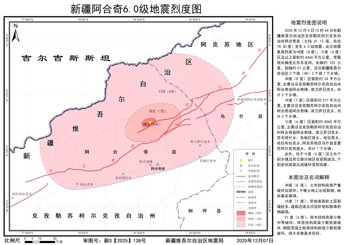 2025年12月4日15时44分,阿合奇县发生6.0级地震。地震发生后,按照自治区抗震救灾指挥部和中国地震局工作部署,新疆地震局派出现场工作队,依照《地震现场工作:调查规范》(GB/T 18208.3-2011)、《中国地震烈度表》(GB/T 17742-2020)、《地震烈度图制图规范》(GB/T 38226-2019)等标准规范要求,对灾区82个调查点开展了实地震害调查,并充分参考震区地震观测资料、余震分布、震源机制、无人机影像等成果,确定了此次地震的烈度分布,完成了《阿合奇县6.0级地震烈度图》编制工作,现正式向社会发布。
