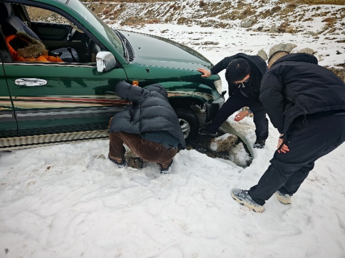 隆冬的乌苏,寒风凛冽。行进途中,车辆在穿越季节性河谷时不慎陷入冰窟。面对困境,观测小组当机立断,背负沉重仪器弃车徒步,直抵监测点,并立即开展氡气通量测定工作,尽管作业现场气温极低,双手冻得红肿僵硬,但他们配合默契,保质保量完成了各项监测任务。